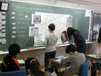これまで子どもたちは、自分の家の周りにある消防施設を調べてきました。そして、本授業では、調べてきた消火器や消火栓、防災倉庫などの場所にシールで色分けしながら地図に貼っていきました。
