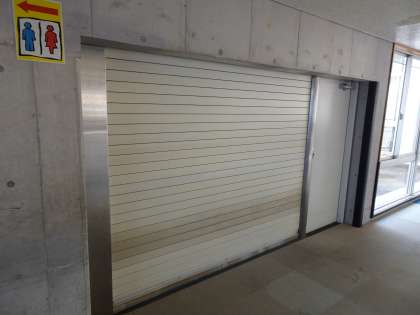 火災が発生。各階段の防火シャッターが閉まった状態での避難、