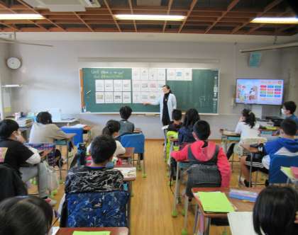 3学期、5年生の外国語の授業では、施設名や道案内の仕方を学習しています。