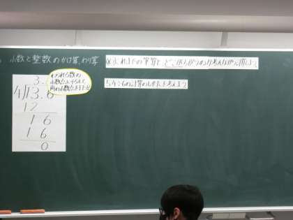 小数のわり算の筆算の方法を学習しています。本授業は、一の位の商が立たない場合の計算を考えました。5.4÷6の筆算では、一の位に0と小数点を付けなければ、商にならないことを確認し、筆算の方法を理解しました。