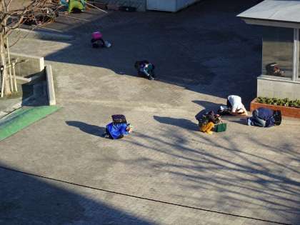 机の下にもぐって「さるのポーズ」を、廊下や校庭にいた