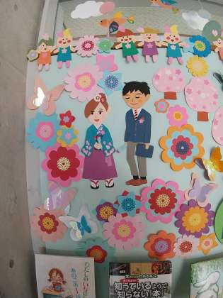 子どもたちや鳥たち、お花たちが卒業を祝っているようです。