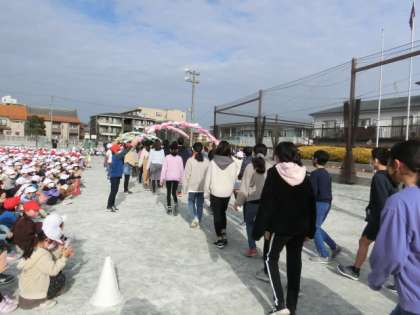 今朝、6年生を送る会を行いました。感染症対策で、校庭での実施となりました。