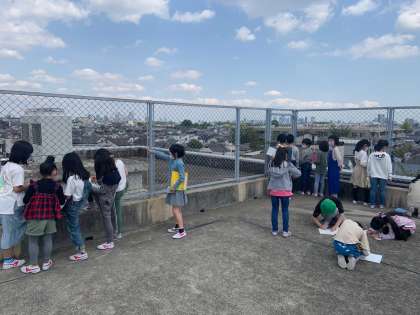 本日は、社会科「わたしたちのまち」で東西南北の方角には何があるのか、学校の屋上にあがり見渡してみました。よく見るスーパーがあるよ、自分のマンションが見えるよ、などとっても楽しそうに学習が進みました。また、天気が良かったので、東京スカイツリーまで見ることができました。「北と東の間にあるね。」と方角を意識しながら探している姿が立派でした。