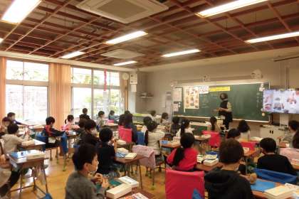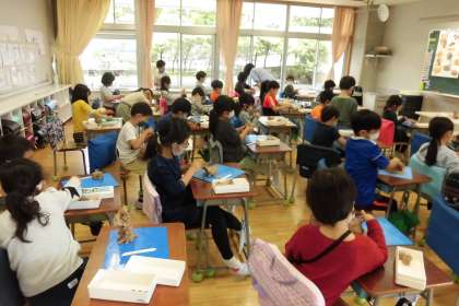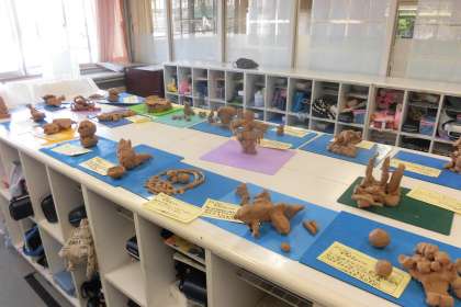 今回は粘土で自分の作りたい想像の生き物「むぎゅたん」を作りました。粘土の塊をひねったり、つまんだりして表したい形を作り出しました。細かい部分は竹べらや爪楊枝で模様を付け、工夫する姿もありました。「この『むぎゅたん』はどんな特徴があるの」と問いかけると、「大きな爪で木に登ります。」「背中のトゲは硬くて、盾になります。」「お腹に赤ちゃんがいます。」といろいろな思いがつまった作品ができあがりました。