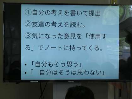 そして、話題を決め、まずは自分の考えとその根拠となる理由を明らかにすることができました。ロイロノートを活用した話し合い活動、考えを共有することで自分の考えを深めたり、広げたりできる場の設定を取り入れた授業になりました。