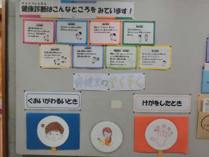 今の掲示物は、『健康診断はこんなところをみています!』と