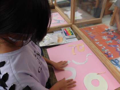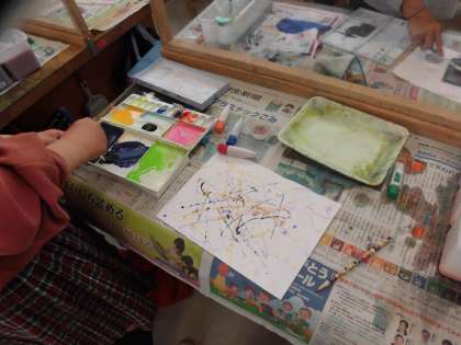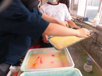 4年生は、筆以外のさまざまな用具を使って絵の具あそびをし、その模様の紙を利用して、はり絵の作品を製作しているところです。ブラシやローラーで彩色したり、絵の具をつけたビー玉をころがしたり、マーブリングで紙を染めたりしてできた「じぶん色紙」がたくさんできました。子どもたちは、思いがけない偶然の模様の美しさに声をあげて驚いていました。はり絵の課題は、踊るアルファベットを表現する「ABCダンサー」です。「どの紙を使おうかな。」「どんな組み合わせにしようかな。」と想像力を働かせ、じっくり考えながら製作していています。4年生最初の作品の完成が楽しみです。