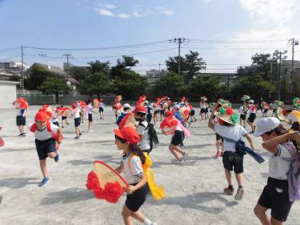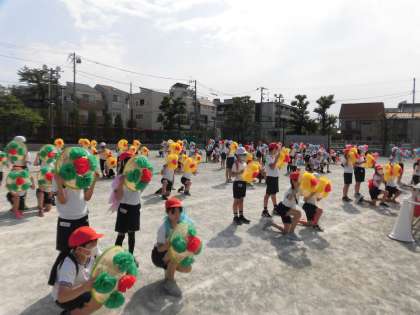 4年生の表現練習も大詰めに入ってきました。クラスカラーの花を作り、自分の花笠を作りました。本番の笠を持つと今まで以上にやる気が出ているようにを感じました。広い校庭での隊形移動は難しいです。けれど、自分たちの踊りの動画を見て、どこを直すと良いのか確認して練習にのぞむことで日に日に上達しています。当日を楽しみにしていてください。