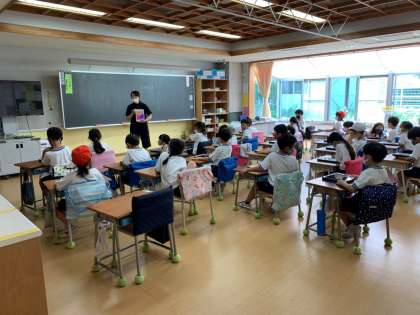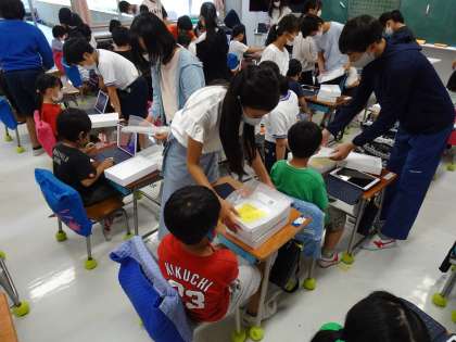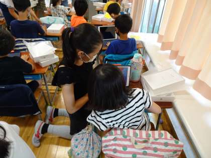 6月1日(火)に1年生にタブレットが配付されました。配付日には、6年生が配付するための事前の準備やケースに入れる作業を1年生と一緒に取り組んでくれました。実際に手に持って子どもたちは大興奮でした。