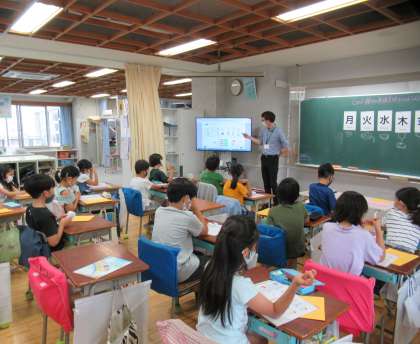 4年生は、新しく曜日の英語を学び始めました。まず、月曜日から日曜日までの英語をALTと一緒に発音練習しました。木曜日の発音が少し難しかったのですが、練習を重ねると自信をもって発音できる子が増えてきました。その後、曜日と発音の似ている食べ物を組み合わせた歌を歌ったり、ピクチャーカードを使ってゲームをしたりしました。次回以降は、曜日の表現と予定を組み合わせた学習をする予定です。