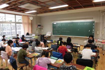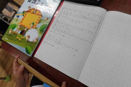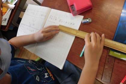 長さの意味、長さの単位「cm」「mm」、長さの測定を勉強しています。今日はどうすればまっすぐな線がかけるか考えました。かきたい長さの始点と終点を打ち、目盛りのついていない側で、2つの点からずれないように結びました。振り返りのとき、「ものさしは決まった長さの直線をかくときは、とても便利です。」と発言し、決まった長さの直線をかくことができるようになりました。