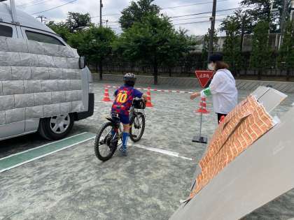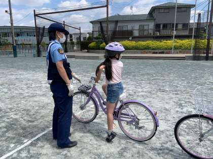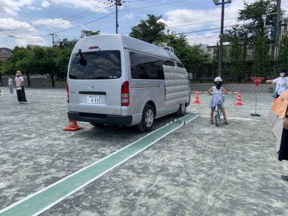 校庭では、実際に警察の方に、右・左・右・右後の確認の仕方を教えていただいたり、信号機の色や横断歩道での渡り方を確かめたりして、安全に自転車に乗る方法を学びました