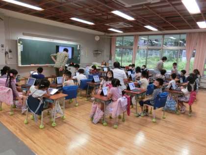 3日からの分散登校に向けて、1年生のタブレット端末の設定や、チームの参加の仕方について、おやじの会の方や、PTAの役員の方の数名の方にご協力いただきました。