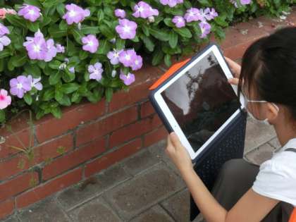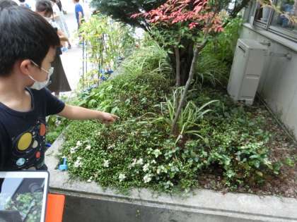 花壇の側では、1年生が生き物を発見してタブレットで撮影しようと