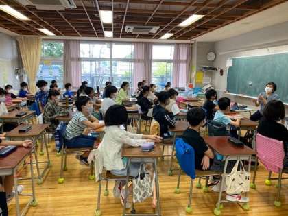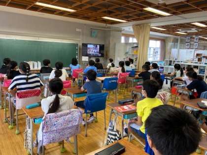本日、5年生では学年朝会を行いました。感染症対策のため、1か所に集まることはせず、オンラインで各学級に配信しました。