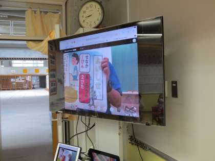 テレビから流れる映像を見ながら、頑張って姿勢よく話を聞いていました。
