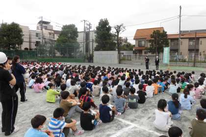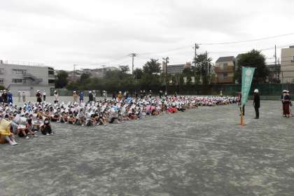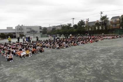 2学期最初の避難訓練を行いました。多くの児童が落ち着いて、行動することができました。放送を静かに聴いて、火災と分かると、素早くハンカチ等で自分の鼻と口を押さえ、煙を直接吸わないよう避難することができました。校長先生がお話をされる際は、自然と体の向きを変え、聞く姿勢になることができました。「万が一に備え、もう一度自分の行動を振り返ろう。」というお話を聞き、自分の命の守り方を再確認しました。