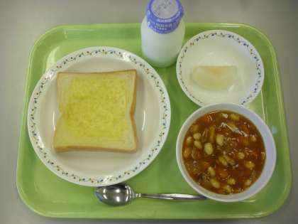 今日の給食は、チーズトースト・牛乳・ポークビーンズ・フルーツ(梨)です。