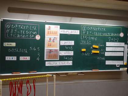 本日5校時に、1年3組で研究授業が行われました。「3つのかずのたしざん・ひきざん」という単元で、話の内容に沿った式の立て方について考えました。