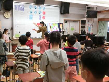 授業の始めは「はくにのって、楽しくえんそうしよう」をめあてに