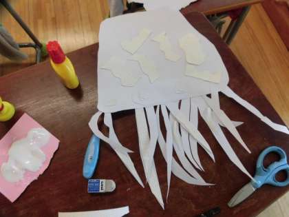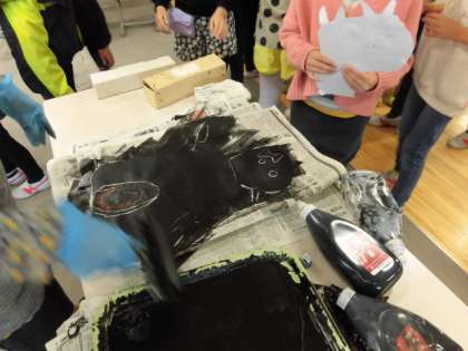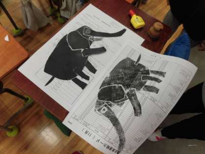 2年生は、先週から紙版画づくりをしています。紙と紙を重ねていろいろな形を作ったり、段差を作ってはっきりした模様を作ったりし、自分の好きな動物を表しました。今日は先週作った動物の試し刷りを行いました。2人組になって協力して版を刷りました。浮かび上がった動物を見て、「段差をつけたから動いているような迫力が伝わった。」「ちょっとした模様が動物の表情をいきいきさせた。」と版画の表現に関心をもち、版で表す活動に楽しく取り組むことができました。