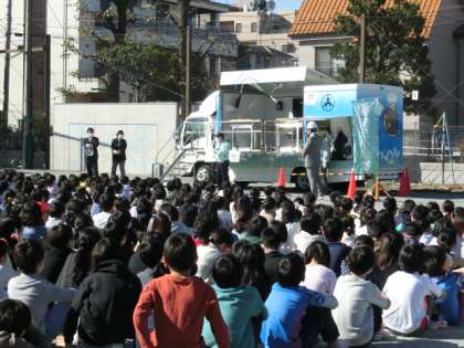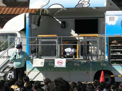 その後2名の教員が「起震車(地震体験車)」の体験をしました。起震車を初めて見る子どもから「おもしろそう」とアトラクションを楽しむような発言がありました。しかし、震度7の揺れの激しさや、様々なものが壊れていく音響が、次第に子どもたちの顔つきを真剣なものに変えました。震災の恐ろしさを知る貴重な体験となりました。