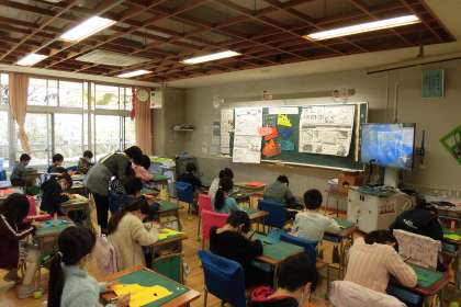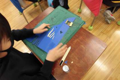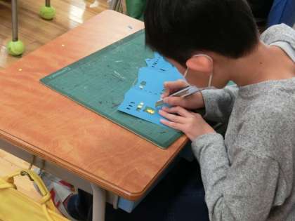 2年生は、先週からカッターナイフを使っています。直線や曲線の切り方を学習しました。今週から、窓のある建物をカッターで作ります。カッターの使い方を確認すると、「ねかせて『チクッ』、ひじで『スーッ』」と、前回学んだことを大きな声で言うことができました。そして、思い思いの窓を作りました。「星形の窓を作ったよ」「僕は恐竜が好きだから恐竜型に切り抜いた」と様々な形を作り、安全を意識して、道具を用いて作ることを学びました。