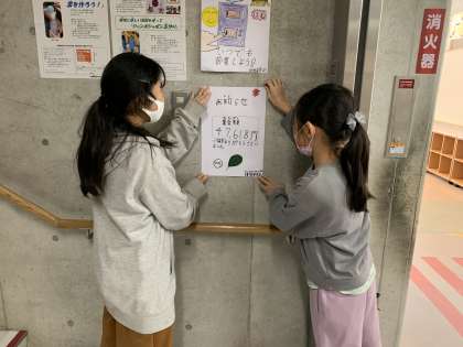 環境委員会では、2学期に行った「緑の募金」活動の振り返り、集まった募金について知らせるポスター作りを行いました。