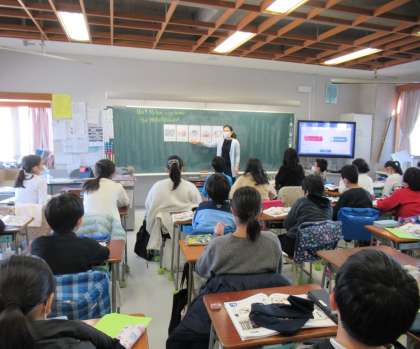 5年生は今職業の表現について学習しています。職業の表現と合わせて、単語の前につく“a”と“an”の違いなども説明しています。HeやSheを主語にした文は2学期に学習したので、今回はその学習と組み合わせ、“He is a teacher.”などと文で言う練習をしています。できるだけスムーズに言えるよう、繰り返しの練習を多く取り入れていく予定です。