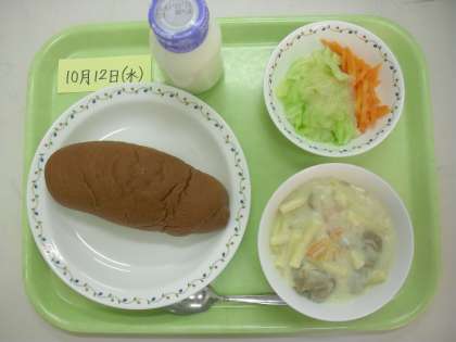今日の給食は、ココアパン・牛乳・マカロニのクリーム煮・きゃべつサラダです。