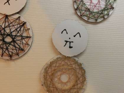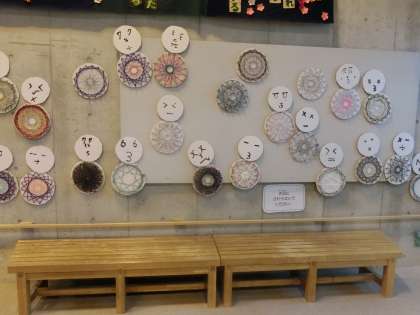 5年生は、ドイツのシュタイナー教育の学校で、数の学習に使用されていたという「糸かけ」を参考に製作しました。きれいな色の糸を一定の規則の順番に糸をかけると美しいマンダラ模様になったので、子どもたちは驚いていました。クラフトに取り組みながら、算数の学習にもなっている、その楽しさを実感しました。また、雪だるまの顔の表情を算数の記号や数字で表していますので、その点にもどうぞご注目ください。