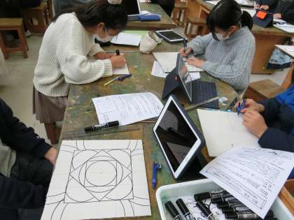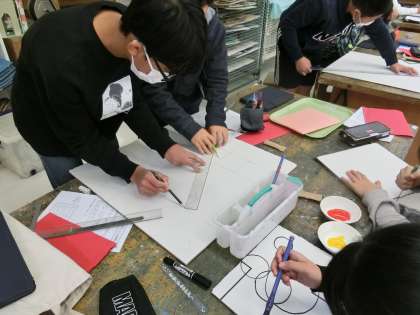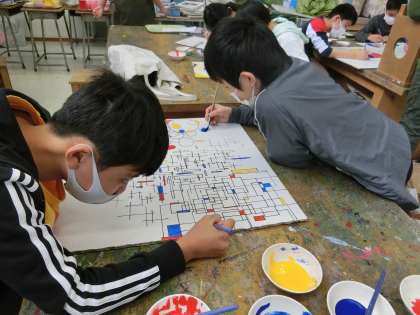 6年生は、校内研究の算数で、「図形」の学習をしていました。その時に、定規やコンパスを使い、集中して線や形を描いていたので、図工でもその力を活かしました。友だちと相談したり、教え合ったりしながら、△□○と直線だけで、バランスを考えながら絵を描きました。色は三原色の赤青黄色と黒だけに限定して、学年のまとまりを表現しました。もうすぐ卒業する6年生。大きく成長した6年生の大きなタワーをどうぞご覧ください。