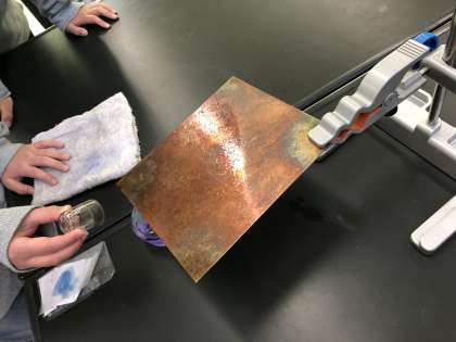4年生の理科「ものの温まり方」の学習では、鉄・水・空気はそれぞれどのように温まるのかを実験しました。水の温まり方は、示温インクを使って調べて青色から徐々にピンク色に変わる様子を見て、子どもたちは、実験結果から「水は、熱したところから上にあがり、水が動くことによって全体が温まる。」と考察することができました。また、空気は温められると上にあがるのではないかと、普段の部屋の様子からイメージして予想して、実験に臨みました。