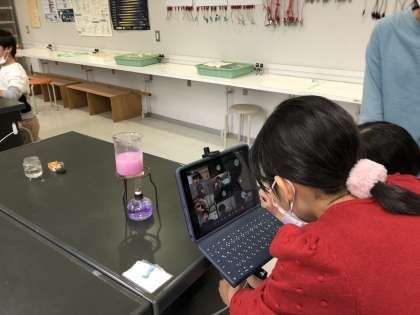 オンラインの友だちが分かるように、タブレット越しに実験の様子を伝えてくれていました。オンラインの子も「色の変化がよく見えた。」「分かりやすかった。」など、学び合っている様子が見られました。
