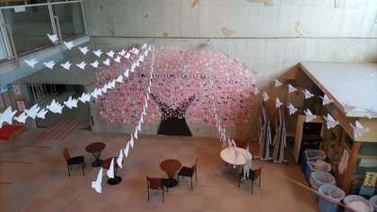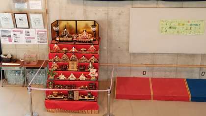 集まれ広場は、ひな人形と、桜の花びらで飾られたありがとうの木でとてもおだやかな空間になっています。