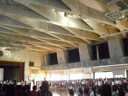 10月14日の朝、体育館で音楽朝会がありました。今回のテーマ曲は「翼をください」です。少し難しい歌詞ですが、スライドで映された歌詞を見ながらのびやかに歌っていました。今回は坂根先生と潮先生もギターで演奏に参加し、クラスの児童の声援を受けていました。