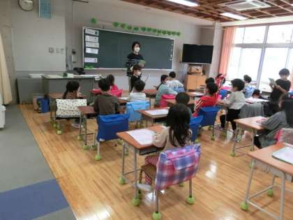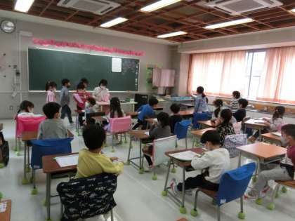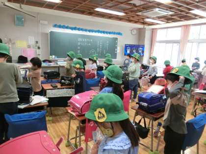 2年生が作ってくれた学校生活の動画を見て、朝や帰りの準備を行いました。