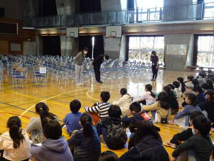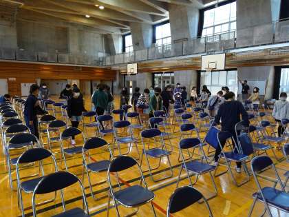 体育館に集合してすぐに、300脚のパイプ椅子を並べました。