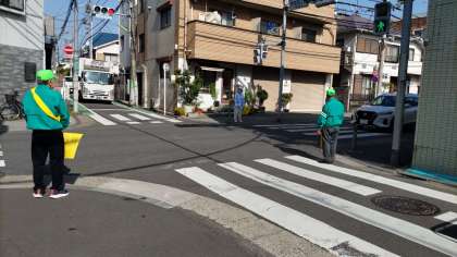 朝の登校時、学校周辺の横断歩道には、桜丘1丁目町会の皆様が見守ってくれています。