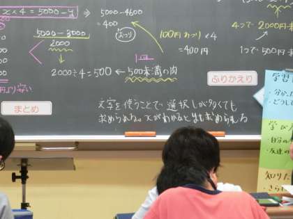 子どもたちは、自分の考えをもち、それを伝え合い、話し合うことで考えを深め、式の中でxやyの文字を使うよさを実感していました。