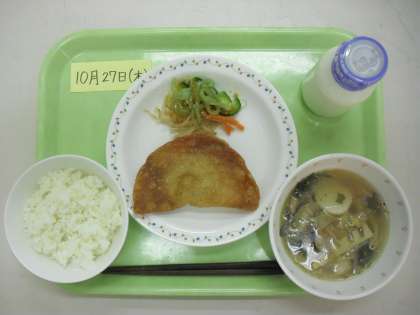 今日の給食は、ごはん・牛乳・ジャンボぎょうざ・こんにゃくサラダ・トック入りスープです。
