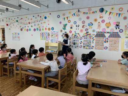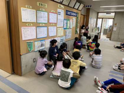 生活科では、2年生が学校の中を案内してくれました。2年生の説明を一生懸命聞くことができました。プールの場所を教えてもらい、1年生は新しい発見にとても嬉しそうでした。