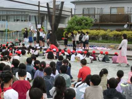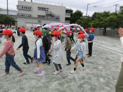 本日、2時間目に校庭に全校そろって、1年生を迎える会を行いました。