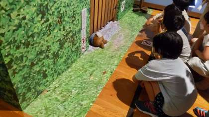 英国の作家ビクトリクス・ポターが描いた原画はとても小さくて繊細なものが多く、子どもたちは絵をのぞき込み夢中で見入ってました。