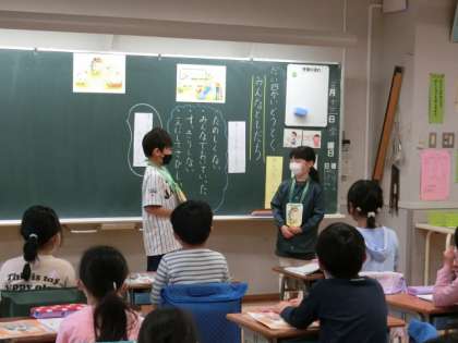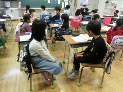そして、かめさんは、りすさんのために考え「ぼくの背中に乗りなさいよ」と声をかけました。その時のかめさんやりすさんの気持ちになって、2人組で気持ちを伝え合ったり、役割演技で発表したりしました。
