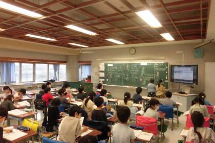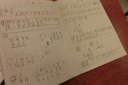 2年生は、ひっ算のやり方を理解する学習をしています。位をそろえて縦に書き、一の位から計算して、十の位を計算しています。一の位で、10のまとまりができたら、十の位に1を繰り上げることも、しっかり理解することができました。ノートに丁寧にひっ算を書いたり、どのように計算をしたのか友だちに手順を説明したり、集中して学習に取り組むことができました。