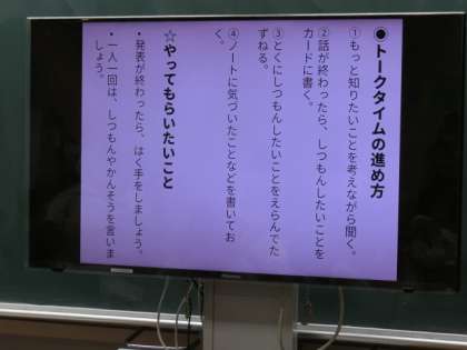 これまでの学習で友だちに伝えたいことを話す準備をしてきました。そして、今日の授業では、「トークタイム」を設け、友だちに話しました。そして、聞いている友だちは、最後までよく聞き、もっと知りたいことを質問したり、感想を伝え合ったりすることができました。