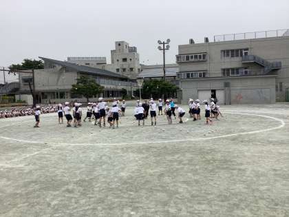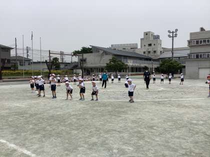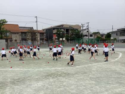 3時間目に学年で団体競技の練習を行いました。今年の一年生の団体競技は、チェッコリ玉入れを行います。曲に合わせて踊り、玉入れを行います。練習では、かごに向かって紅白玉を一生懸命、投げていました。運動会まであと一週間、練習も総仕上げに入っています。