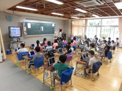 本日より、1年生もタブレットを使っての学習が始まりました。